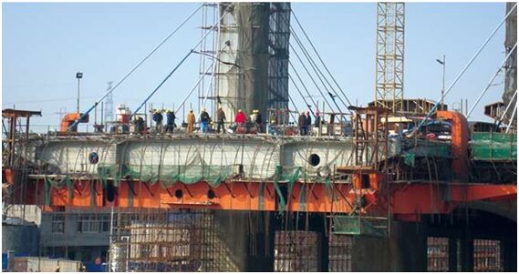 前支點(diǎn)掛籃適用于橋面寬大,節(jié)塊重量重,節(jié)塊長度大的大型斜拉索懸澆橋梁。掛籃的大部分構(gòu)件全集中在底托系統(tǒng)和行走系統(tǒng)上,掛籃沒有主構(gòu)架系統(tǒng),同時提吊系統(tǒng)也由橋梁的斜拉索承擔(dān),單支掛籃重量較其他形式掛籃重。